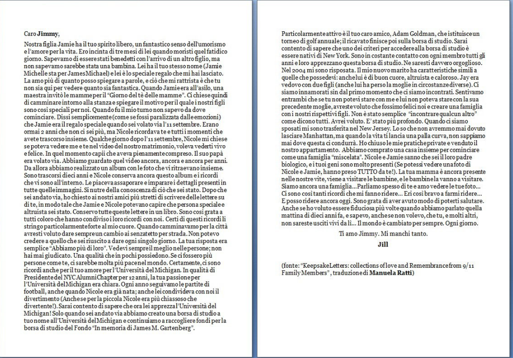 Il suo vero nome era James Micheal Gartenberg, volato via dalla Torre Nord a 35 anni, nel suo ultimo giorno al World Trade Center, avendo trovato un nuovo lavoro come agente immobiliare a Midtown. Jim era sposato da 7 anni con Jill, l’amore della sua vita, e insieme avevano due figlie: Nicole, di due anni, e Jamie, ancora nel grembo materno. Quella mattina, Jim era uscito di casa molto presto, convinto che il suo ultimo giorno sarebbe stato un giorno perfetto, un giorno che avrebbe ricordato per sempre perché gli avrebbe permesso di chiudere un capitolo della sua vita e iniziarne uno nuovo, avente come prima pagina la nascita della sua secondogenita. Si recò all’86esimo piano della Torre Nord, e iniziò normalmente il suo lavoro. Erano le 9.59 quando la vita di Jim e della sua famiglia e di tremila persone e dell’intera umanità cambiò radicalmente. Il volo United Airlines 175 si schiantò sulla torre meridionale che, dopo un incendio di 56 minuti, crollò; la torre settentrionale (torre in cui era presente Jim) collassò, invece, alle 10.28, dopo un incendio di circa 102 minuti, tempo che permise alle vittime di dichiarare amori mai confessati, o di affermare sentimenti già scoperti, o di avere paura e scappare. Così Jim raccolse il telefono e chiamò sua moglie: <<C’è un incendio. Ti amo, riferisci a Nicole che la amo. Non so se mi riprenderò, vi amo così tanto>>. Furono queste le ultime parole di Jim, furono queste le parole che la moglie Jill ricorderà per sempre, in quei momenti in cui il buio prende il sopravvento e allora si ha bisogno del colore della sua voce. Perché accadono eventi che sconvolgono l’animo umano, accadono eventi in cui tutto il mondo resta immobile, ad occhi chiusi, ad attendere qualcosa che permetterà al bene di vincere finalmente la sua battaglia. Jim è così divenuto stella, è divenuto una delle tante persone a cui si dovrebbe pensare ogni qualvolta un pugno sostituisce una carezza; egli è divenuto angelo, angelo che custodisce i cuori, non solo di Jamie e Nicole o di Jill, ma dell’intera umanità. “Quando camminavamo per la città avresti voluto dare sempre un cambio ai senzatetto per strada” – scrive la moglie Jill in una lettera al marito – “la tua risposta era semplice: <<abbiamo più di loro>>. Vedevi sempre il meglio nelle persone; non hai mai giudicato”. Perché Jim era così: Jim riusciva sempre a donare aiuti a mani bisognose o a cuori fragili; Jim non era solo buono, lui era il bene. E quando qualcuno rappresenta il bene, il male vuole portarselo via, convinto che questo funzioni per distruggere l’umanità, convinto che persone come Jim siano destinate a scomparire. E allora succede che vivere diventa combattere, combattere contro chi distrugge vite solo per paura di vivere la propria, solo per paura che qualcuno di migliore sia capace di migliorare mondi. Erano le 9.59 dell’11 settembre 2001 quando la vita di Jim e della sua famiglia e di tremila persone e dell’intera umanità cambiò radicalmente: molti potrebbero credere che da allora solo buio invase quelle anime bisognose; in realtà corpi divenuti angeli divennero non solo stelle, ma interi cieli che sovrastano le nostre esistenze, mentre ci guidano in percorsi sempre più tassellati di mete. Oggi le figlie di Jim, Nicole e Jamie, hanno 16 e 14 anni. Ricordano il loro padre come se fosse ancora vivo, come se l’avessero conosciuto davvero, e chiedono ogni giorno, ancora oggi, di guardare il filmato del matrimonio dei loro genitori, per vedere Jim ancora “vivo e felice”. Perché accade così… sono riusciti a spezzare quel bene che era contenuto nella parte più segreta dell’umanità, sono riusciti a creare sofferenze, dolori, pianti, urla, sono riusciti a distruggere tutto ciò che avevamo creato ma oggi… il mondo resta ancora l’unico posto in cui si può vincere quella battaglia da cui tanto speriamo di uscire, e la forza ce la danno loro.. ce la dà Jim che, con le tremila persone rimaste uccise negli attentati, illuminano vite fragili e deboli, vite che non hanno il coraggio di mettersi in gioco e di distruggere quella parte di male che da sempre esiste.